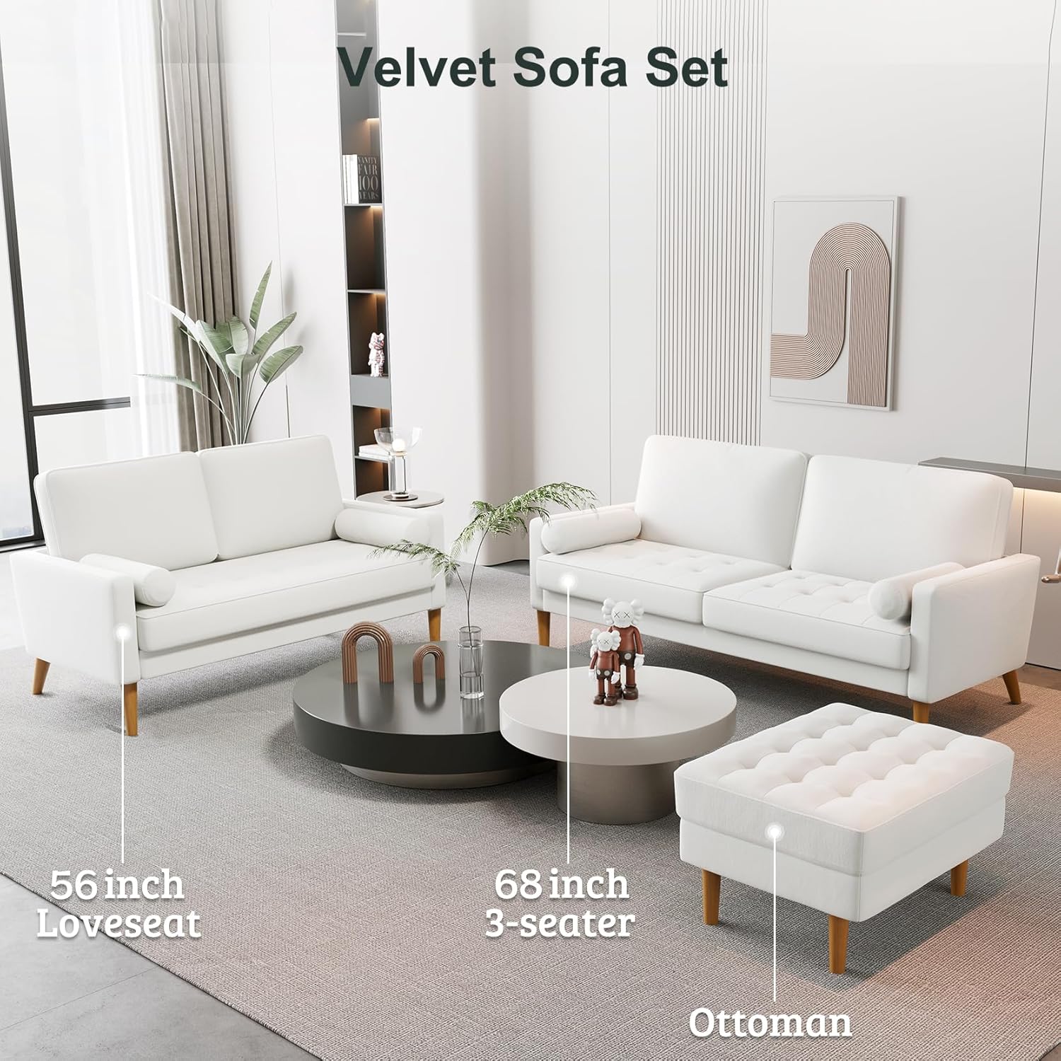 68" Beige Velvet Couch, Comfy Sofa Couch with Spring Cushions, Loveseat Sofa for Bedroom, Sturdy Wooden Small Couch for Small Spaces, Modern 3 Seater Sofa with Tufted Seat, Living Room Couch