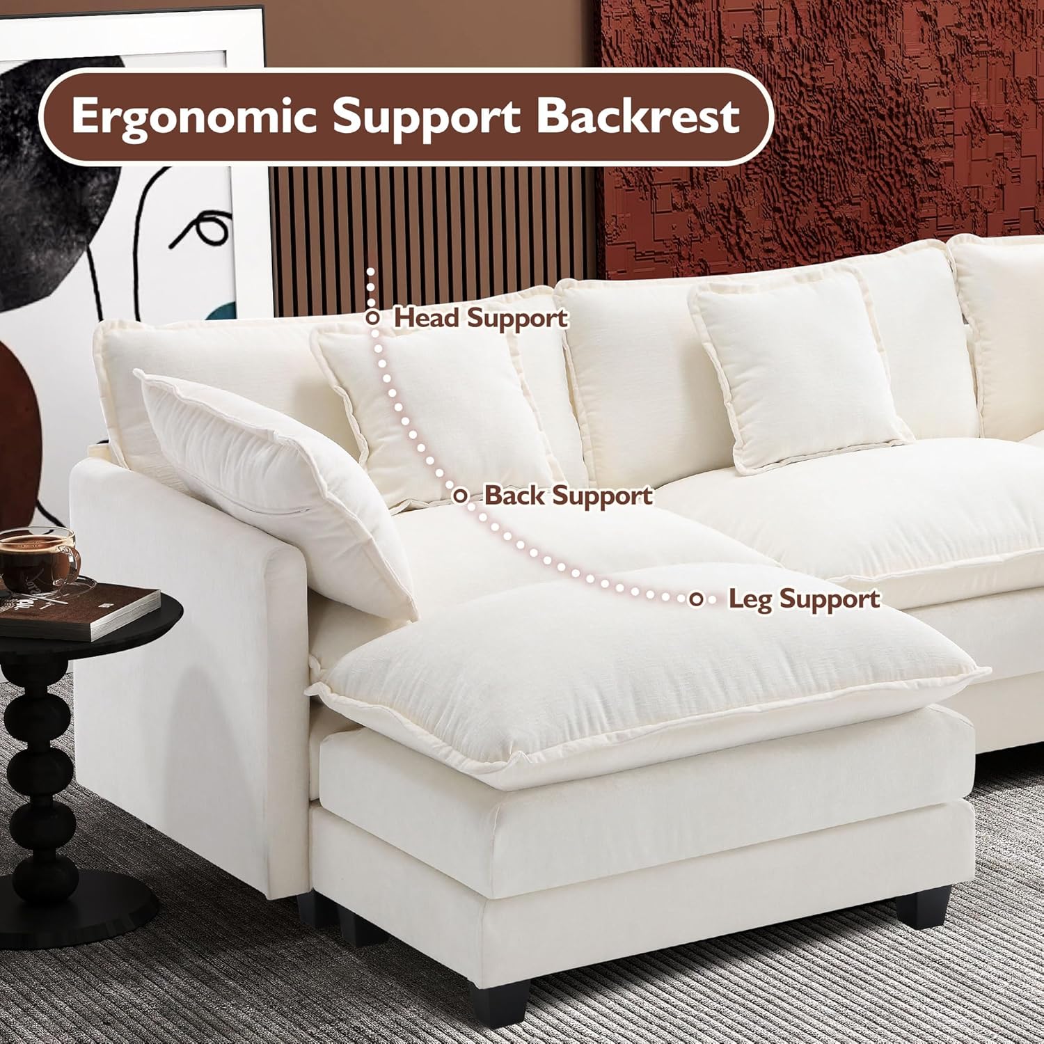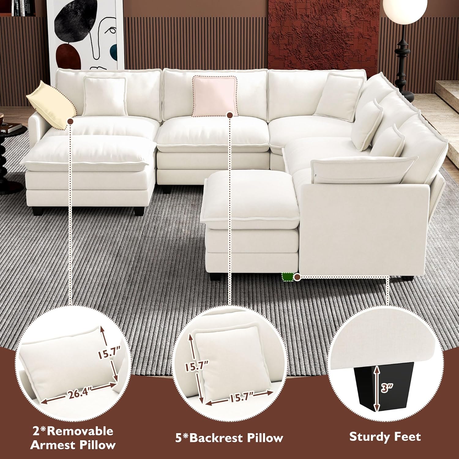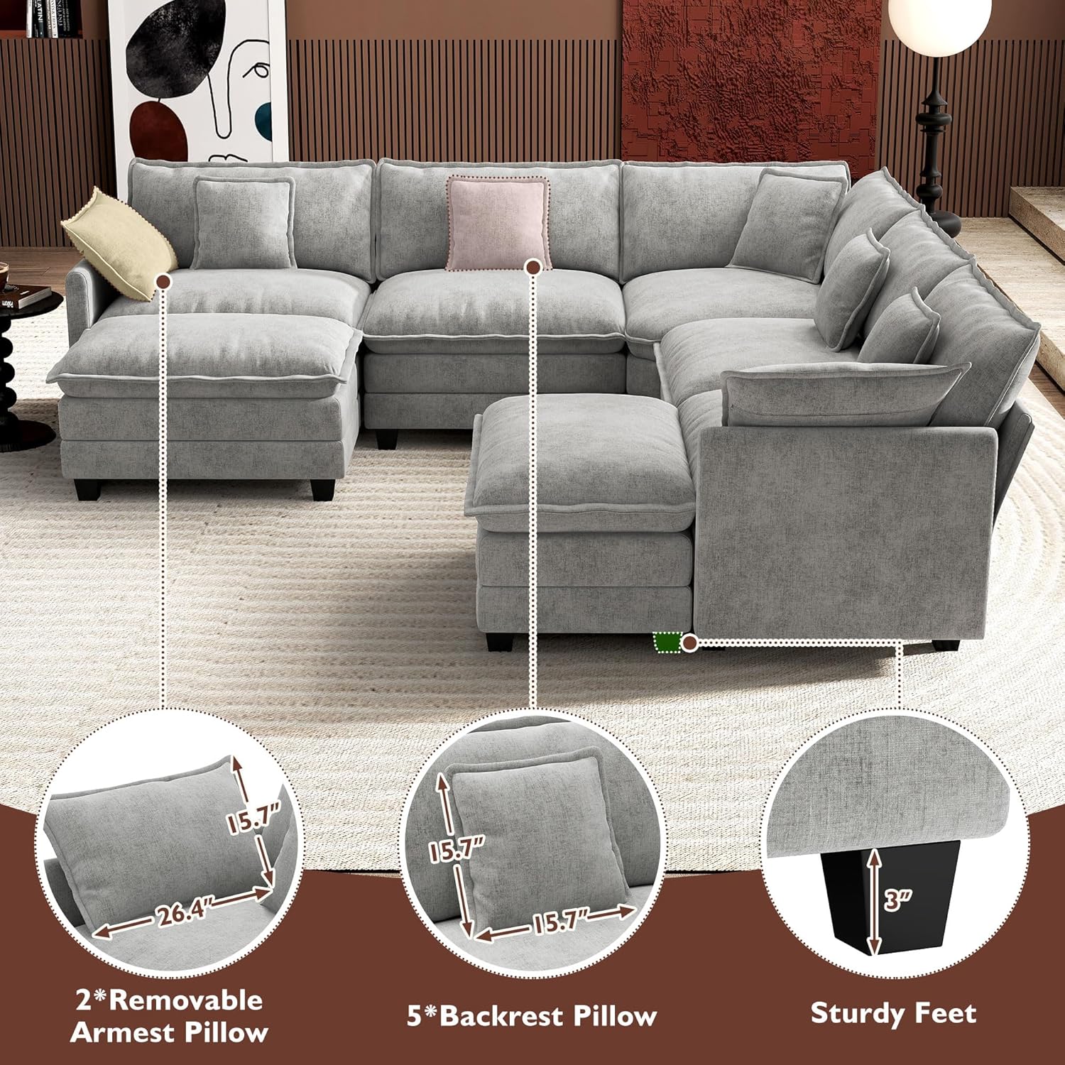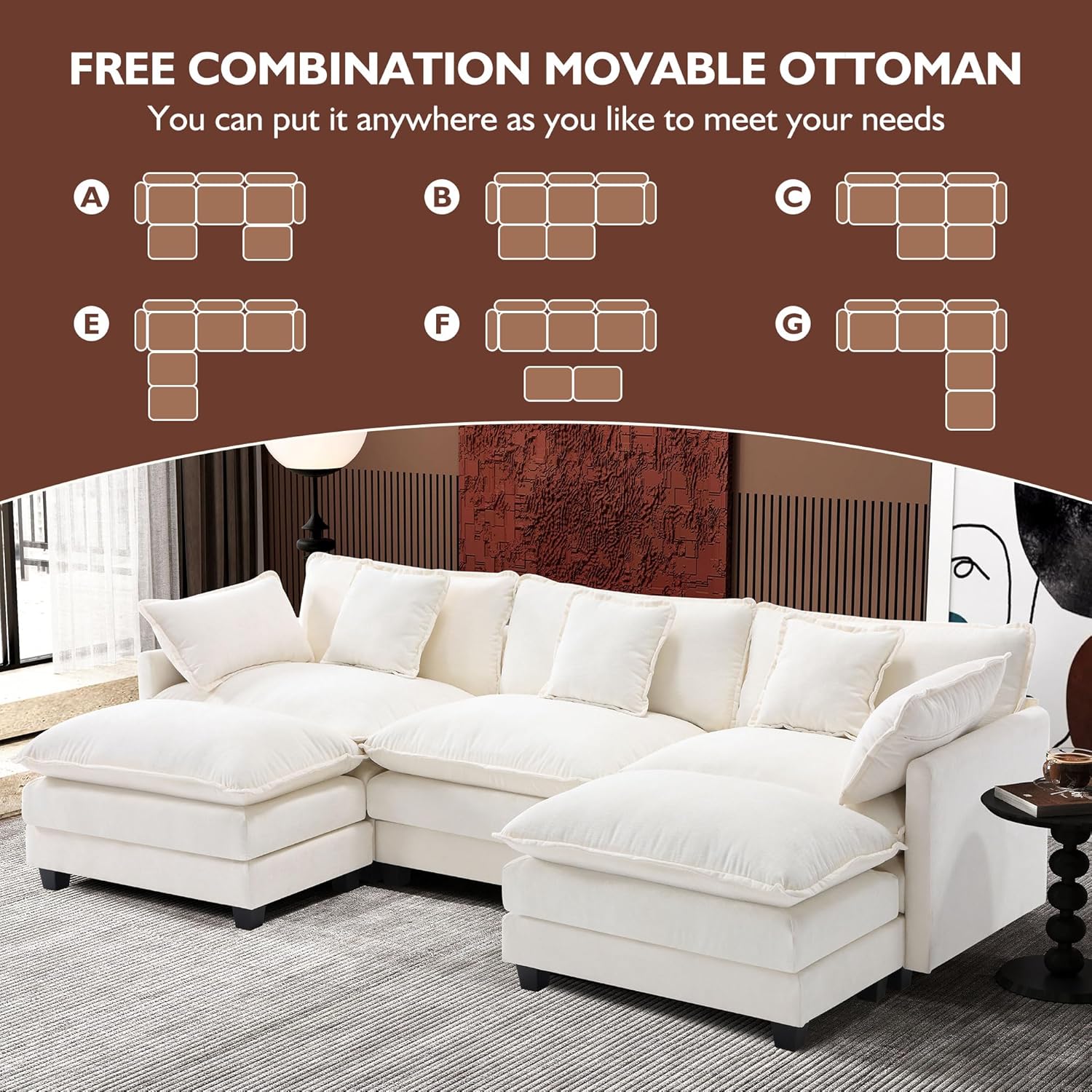 - 【Ergonomic Design】U-shaped couch is equipped with four backrest pillow, two removable armrest pillows and two ottomans, providing extra support for the back and waist. Each pillow feels like as soft as clouds. When you sit on the sofa, it can cling to your back and waist, giving you an extremely comfortable experience.