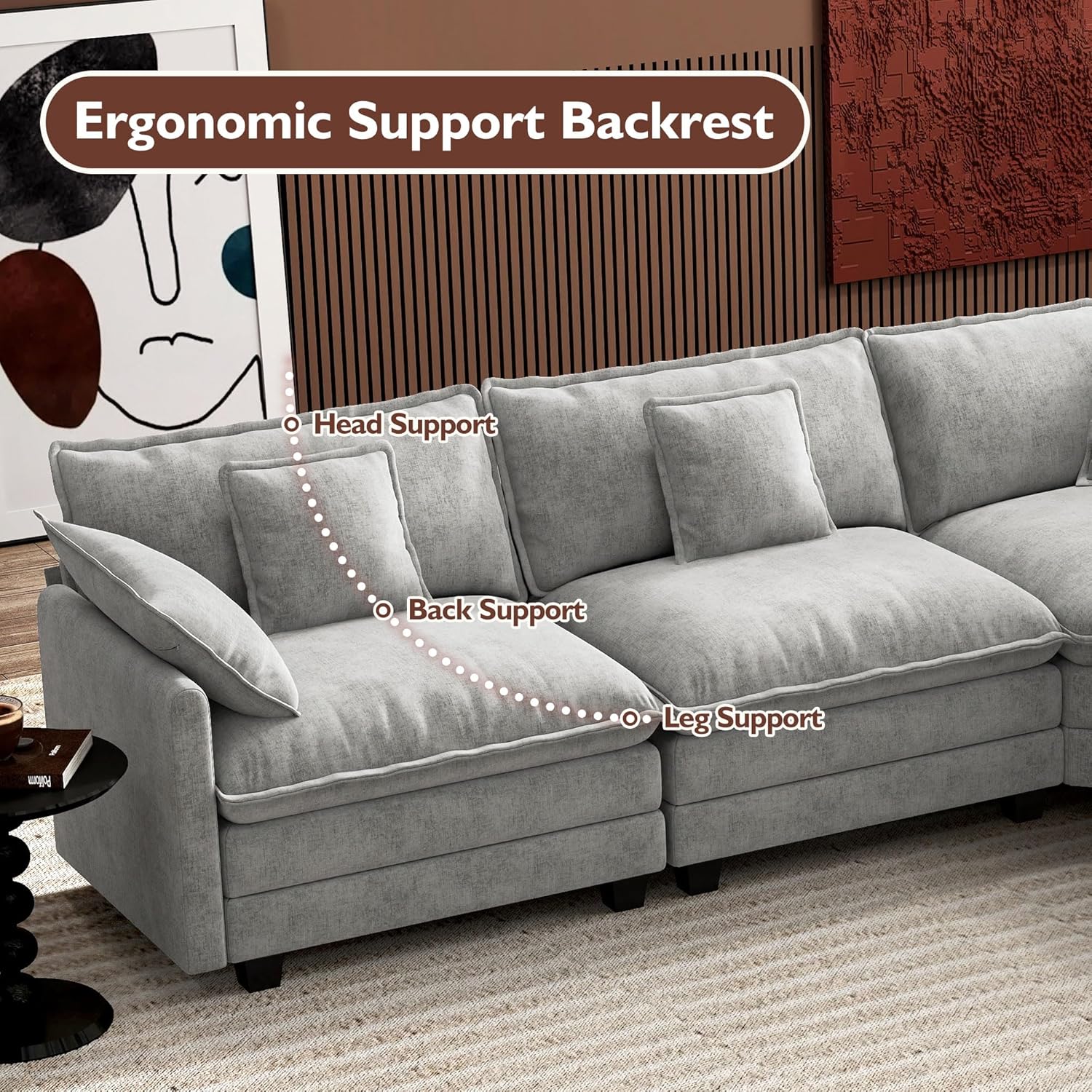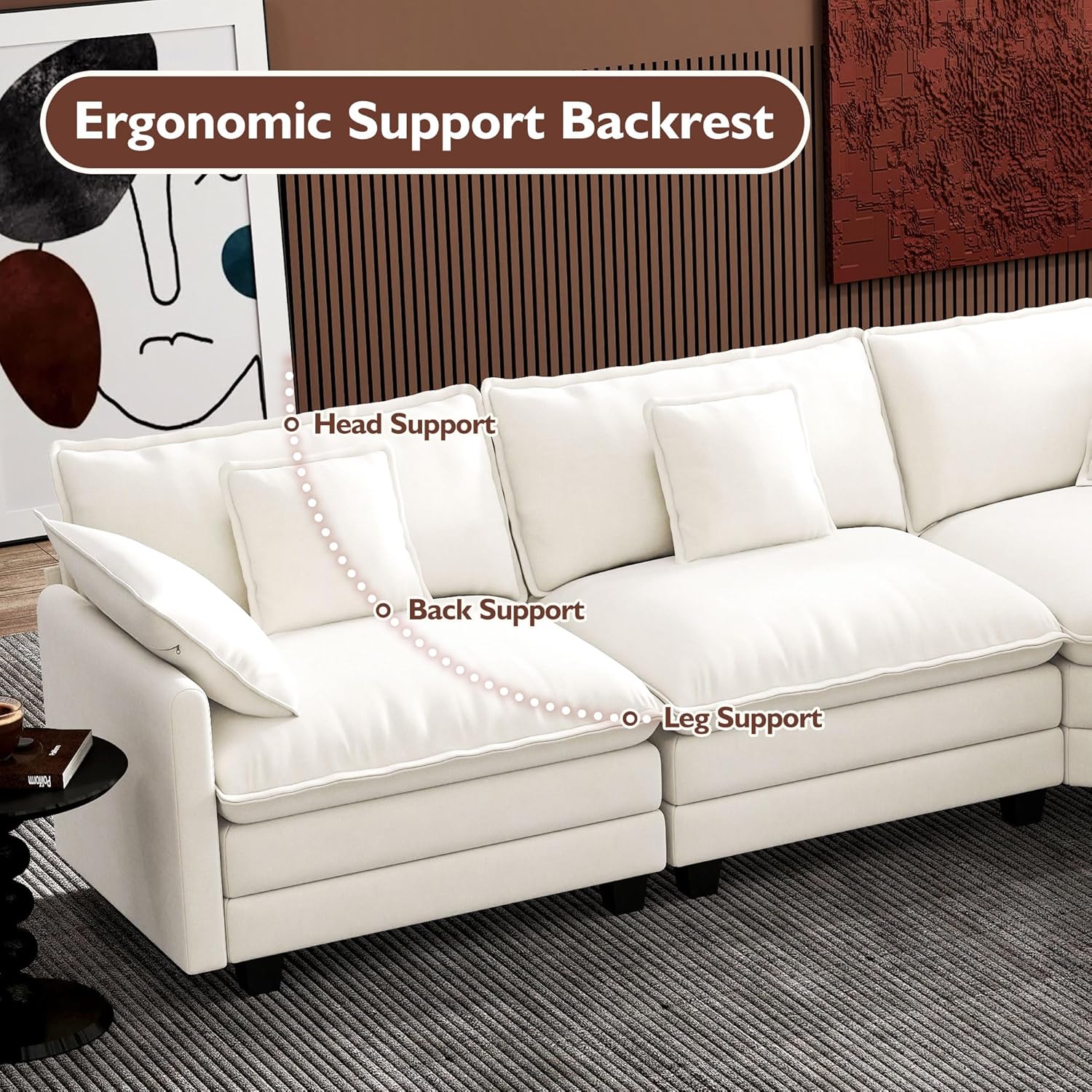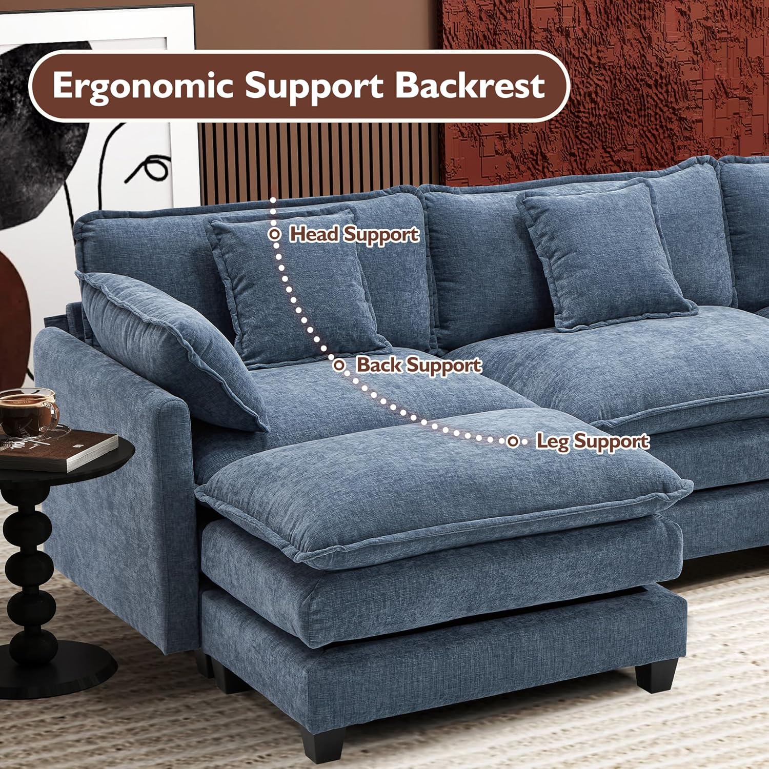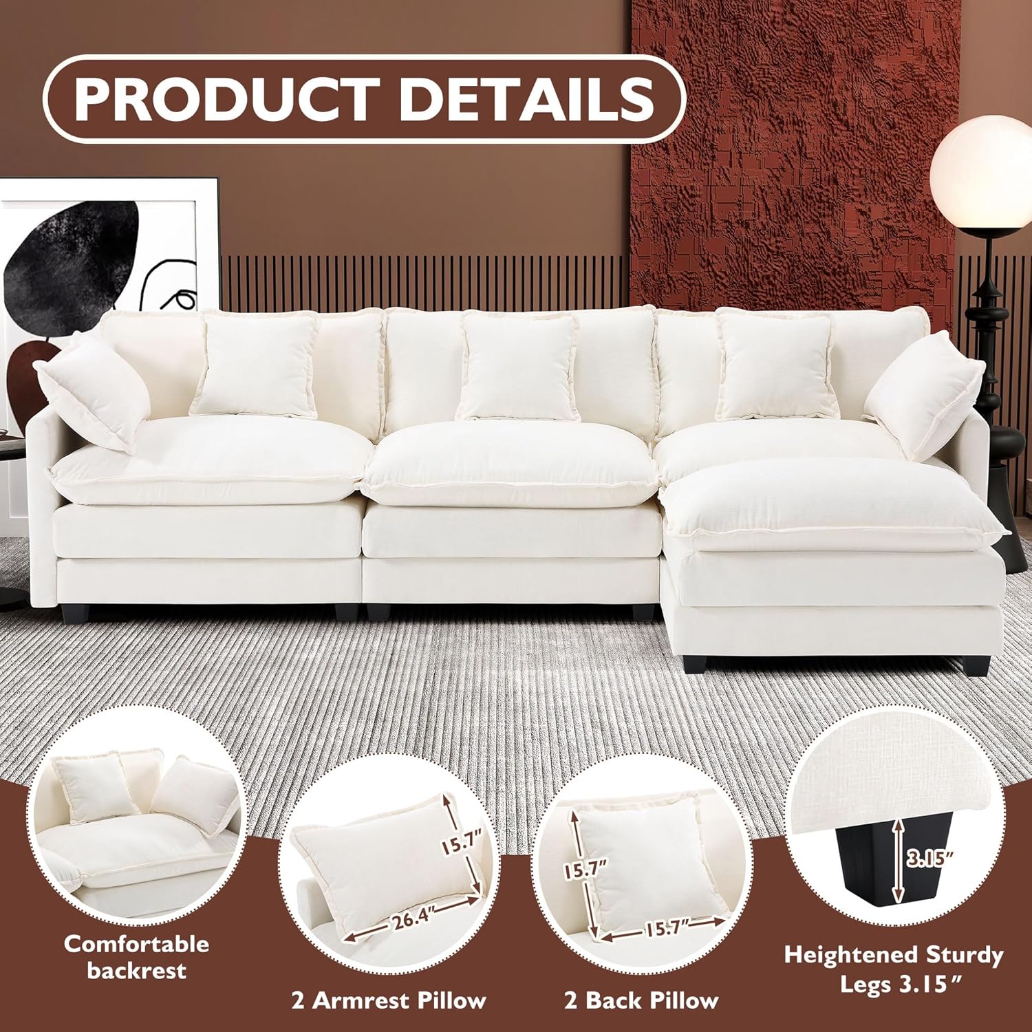 - 【Ergonomic Design】U-shaped couch is equipped with four backrest pillow, two removable armrest pillows and two ottomans, providing extra support for the back and waist. Each pillow feels like as soft as clouds. When you sit on the sofa, it can cling to your back and waist, giving you an extremely comfortable experience.