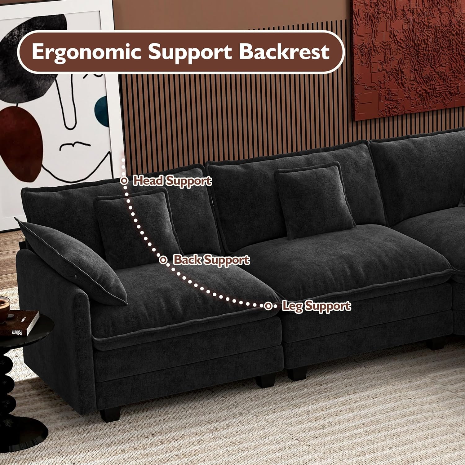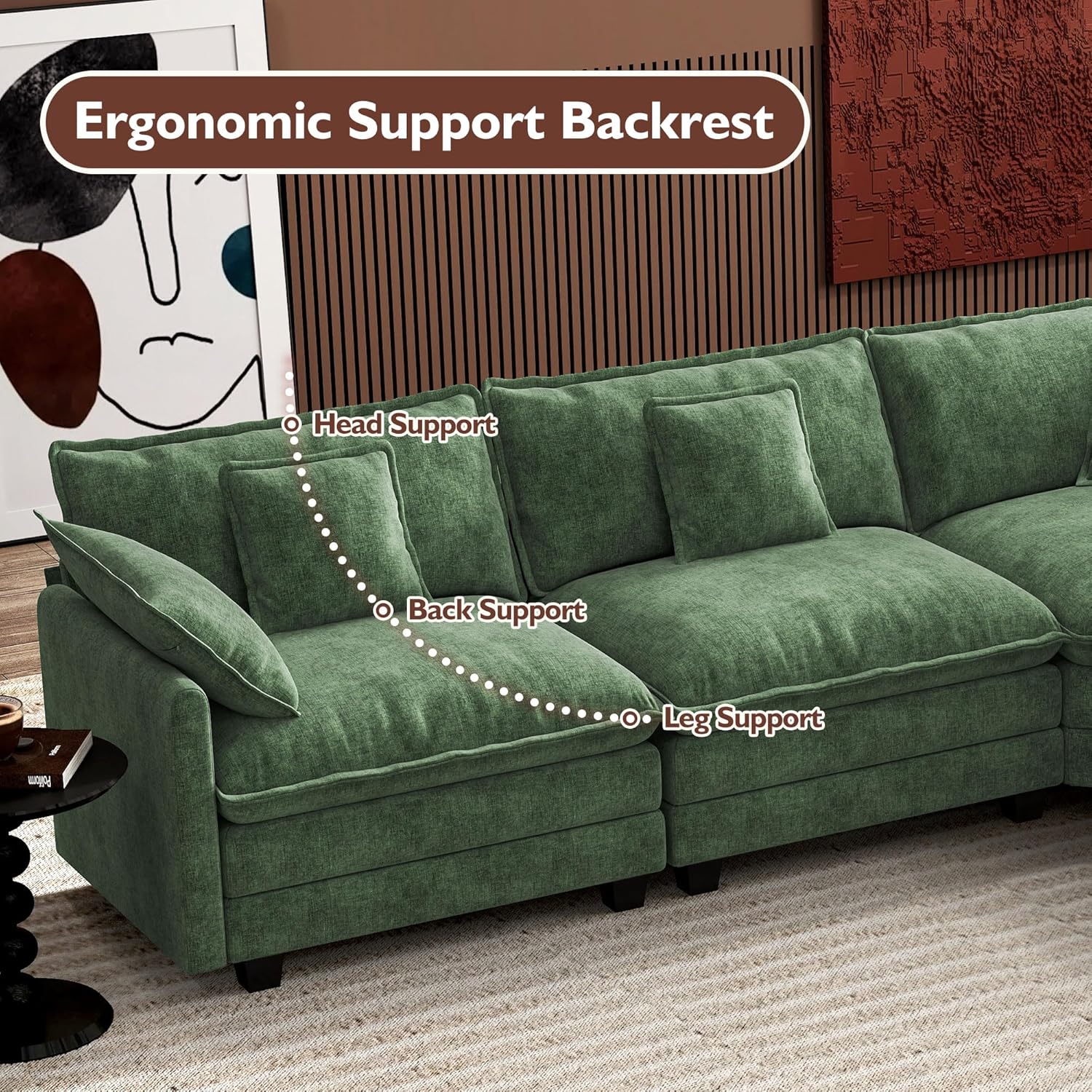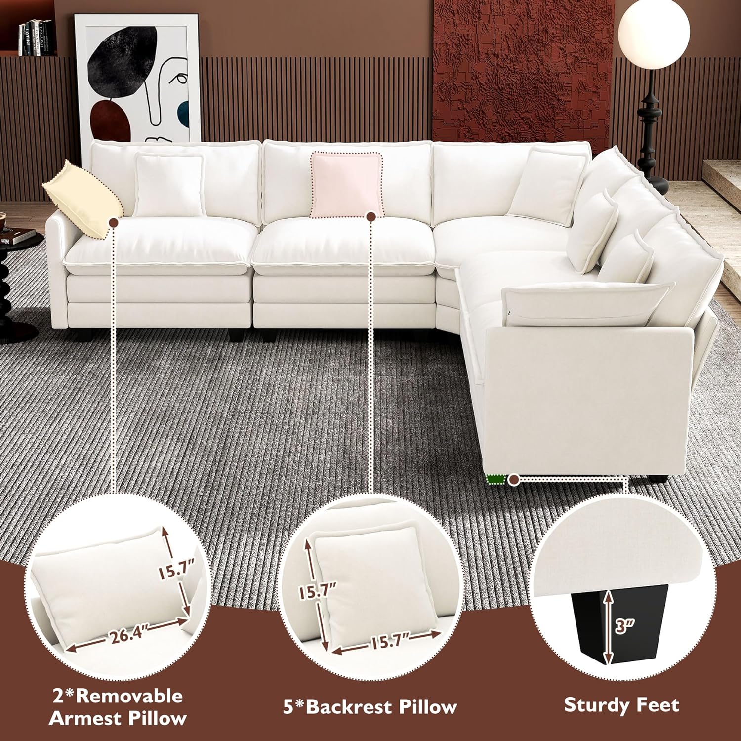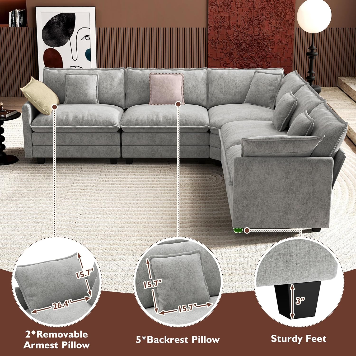 - 【Ergonomic Design】U-shaped couch is equipped with four backrest pillow, two removable armrest pillows and two ottomans, providing extra support for the back and waist. Each pillow feels like as soft as clouds. When you sit on the sofa, it can cling to your back and waist, giving you an extremely comfortable experience.