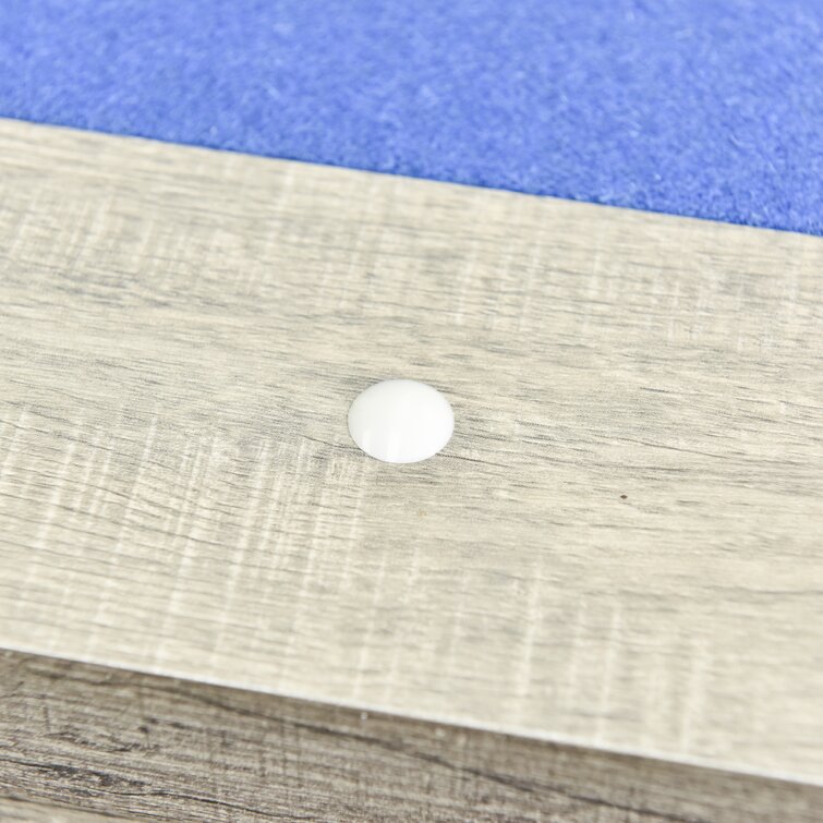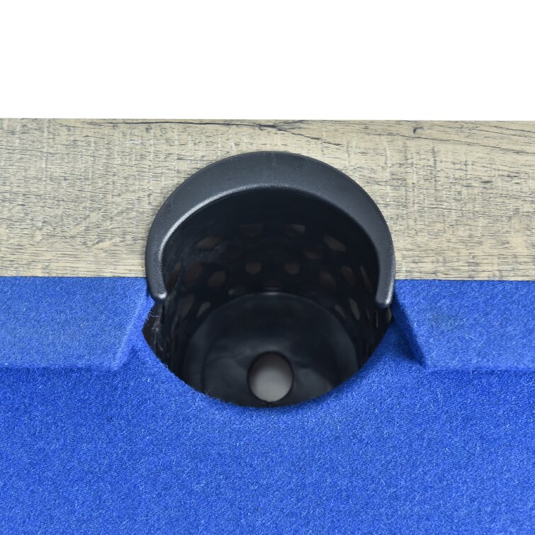 - Pool table playfield: 74.75″L x 36.75″W x 3/4″ thick MDF with blue felt