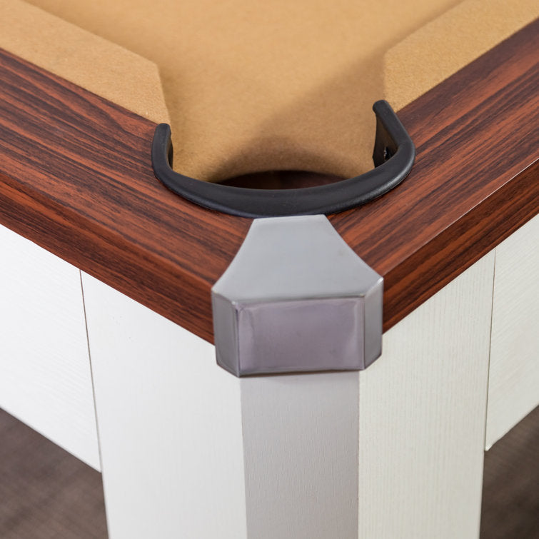- Accessories included: two 2-piece 57″ pool cues, set of 2.25″ pool balls, plastic triangle ball rack, cue chalk, table tennis net and posts, 2 paddles and 2 table tennis balls