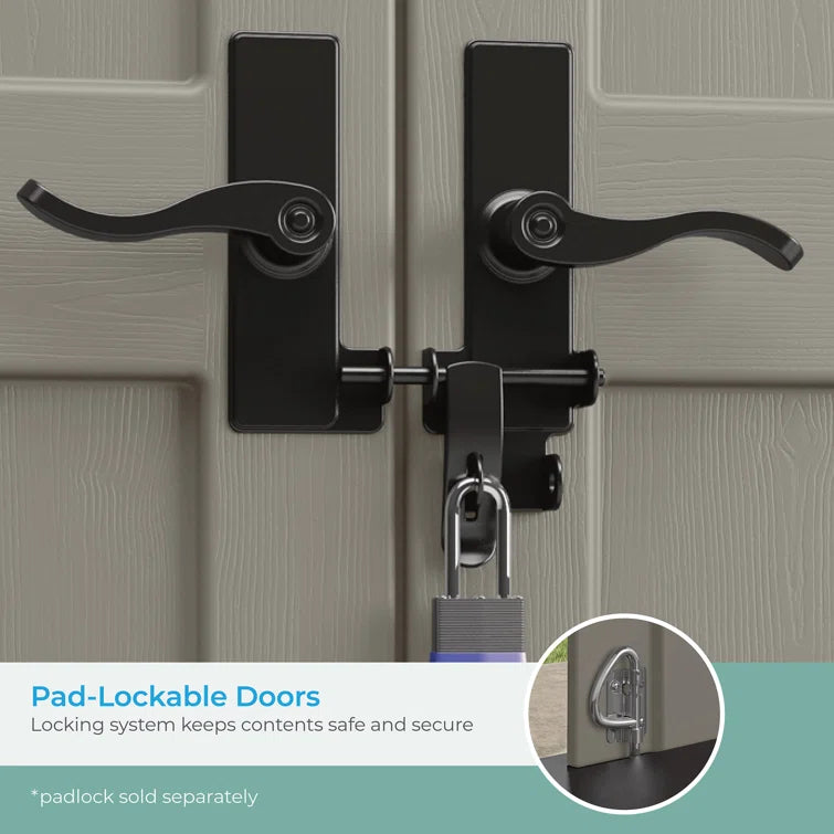 This shed makes essential organization simple. It features a reinforced floor to support tractors and other large items, and can easily house all your tools, outdoor supplies, and more. The multi-wall resin exterior is built for superior durability. Additional features include six skylights to bring in natural light, two corner shelves that can be used in eight different locations, and metal, lockable handles to keep your valuables safe and secure. Sturdy yet stylish, this product stands up to the elements and complements any environment. From organizing everyday accessories to storing large equipment and more, this durable and dependable shed covers all the essentials with ease. Features include steel-reinforced resin construction for superior strength and stability, reinforced floor for heavier items, and pad-lockable metal lever handles to keep contents safe.