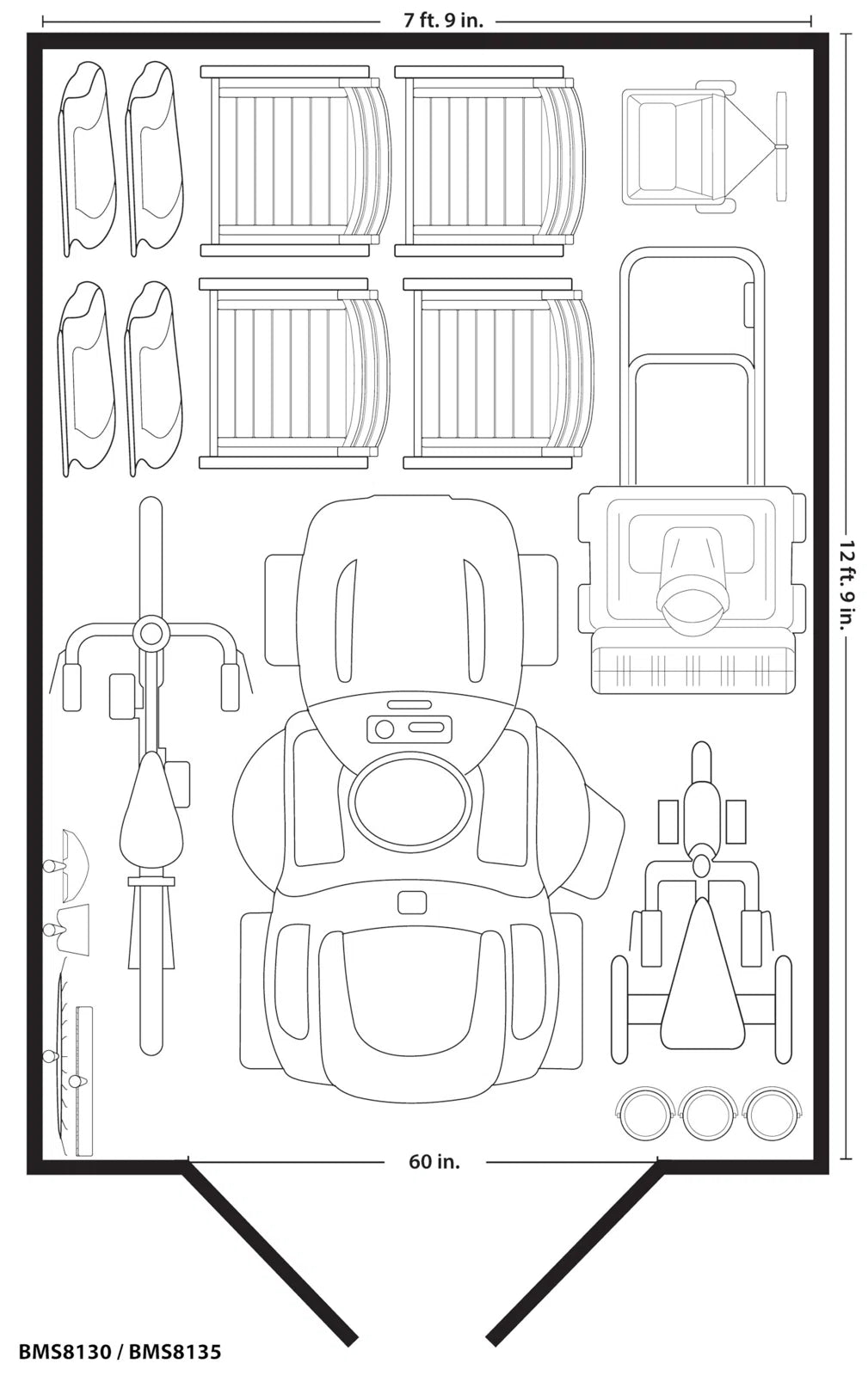 BMS8100Size: 100.5" W x 122.25" D x 103" HBMS8130- Size: 101" W x 103" D x 159" H