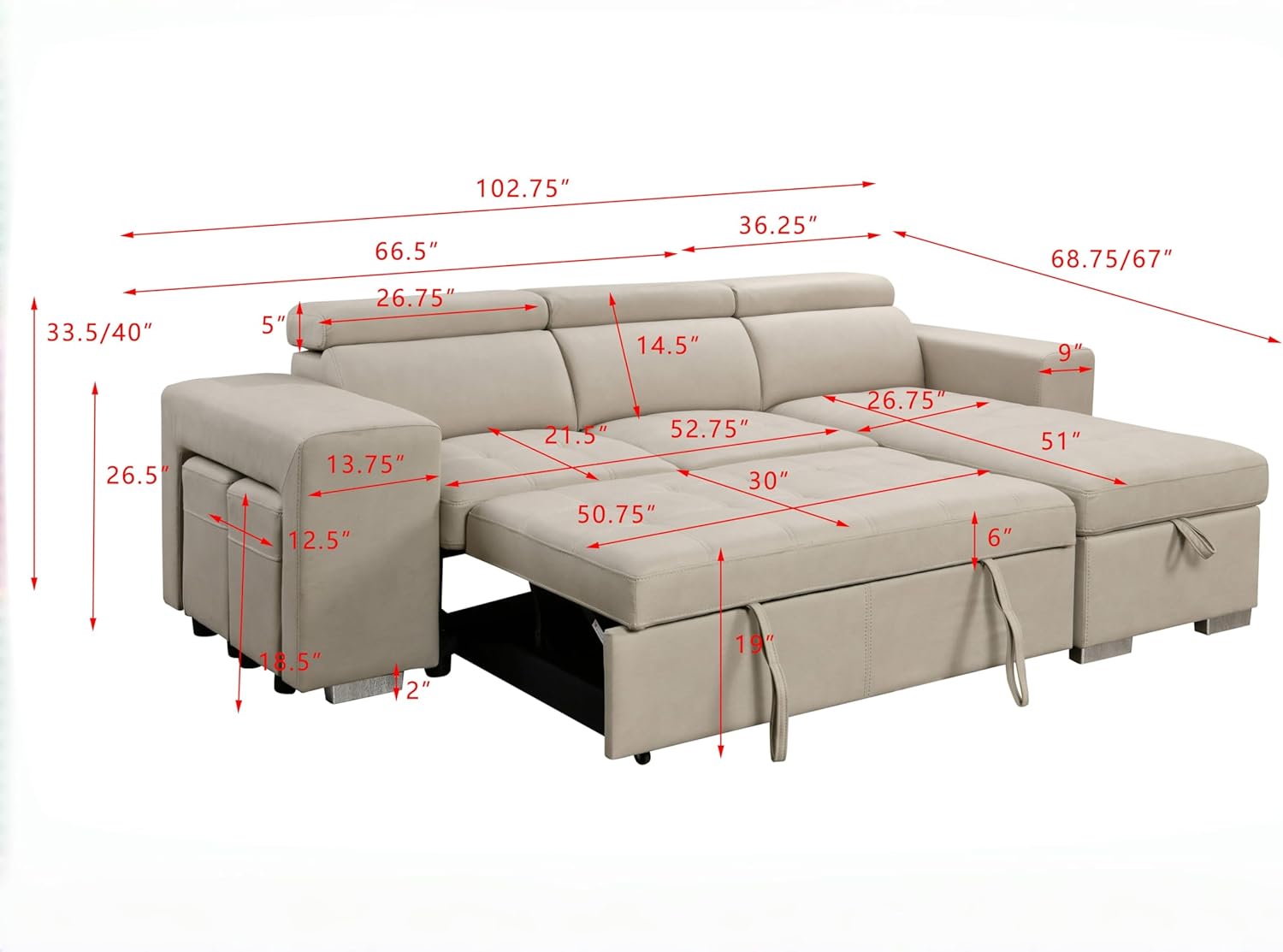 104'' Microfiber L Shaped Sectional Sleeper Sofa Couch with Pull Out Bed and Storage Ottoman, Convertible Couches with Adjustable Headrest for Living Room, Right Facing Chaise. Beige
