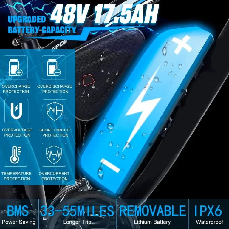 Large capacity 48V 17.5Ah battery provides a long range of 33-55 miles for electric bikes. Battery lockout and 8-9 hour fast charging. The waterproof removable battery allows you to install it while in use, avoiding the risk of theft. Long battery life lets you go further. Ride it and enjoy your relaxing time immediately.